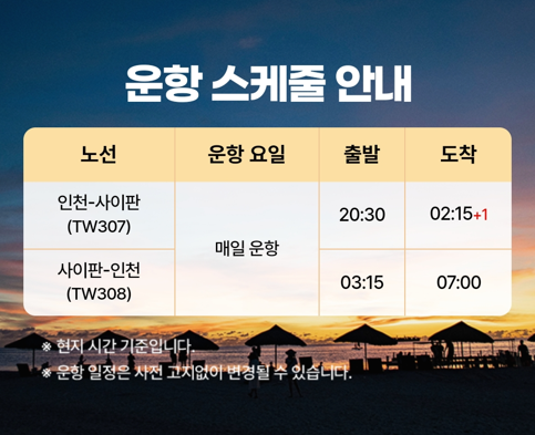 - 운항 정보 : 인천 => 사이판(TW307, 20:30 => 02:15) / 사이판 => 인천(TW308, 03:15 => 07:00) 매일운항