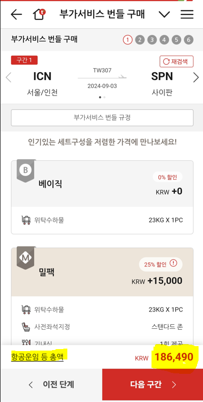 8) 최종운임으로 유류할증료와 공항세가 포함된 최종 186,490원으로 항공권을 결제할 수 있습니다.