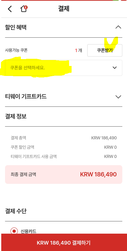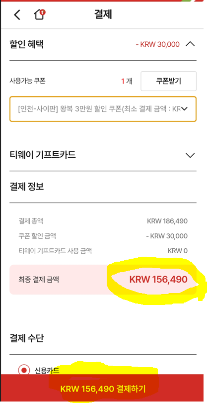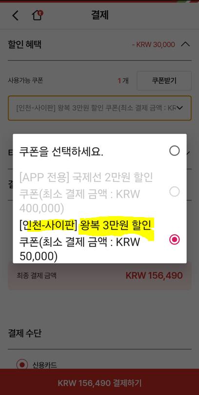 상기 최저가 항공권 결제 금액은 최종 186,490원이었습니다. 여기에 위에 있는 3만원 할인 쿠폰을 다운로드 받아서, 맨 마지막 결제 단계에서 쿠폰을 적용하니, 최종 결제 금액이 156,490원으로 확인이 됩니다.