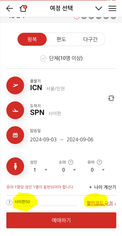 2) 예매페이지 하단에 자동으로 할인코드인 '사이판50'이 표기되어 집니다.