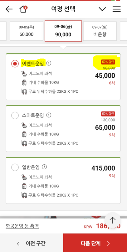 5) 귀국편의 이벤트 운임은 50%할인 적용된 45,000원을 선택했습니다.