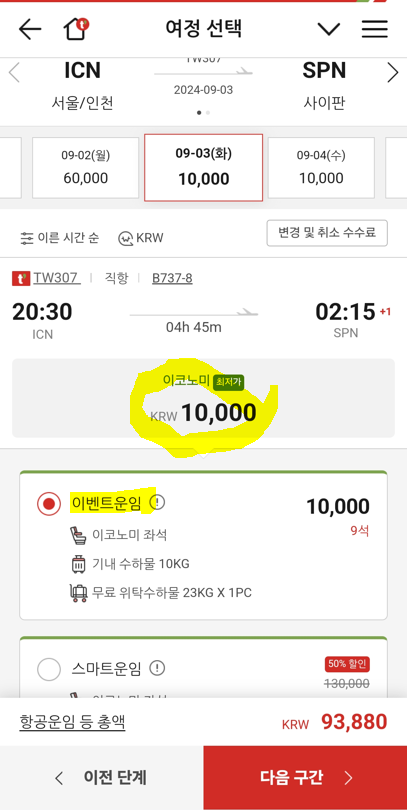 4) 출국편 이벤트 운임으로 10,000원 운임을 선택했습니다.