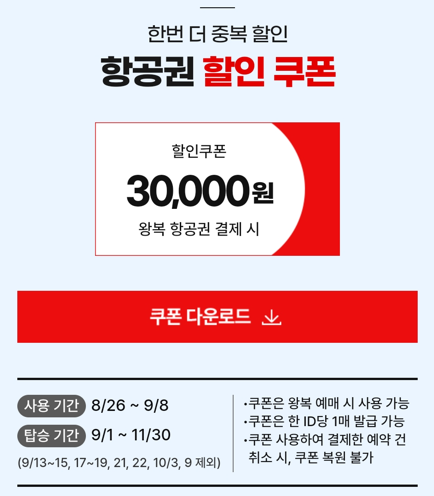 - 할인율 30% : 10/1 ~ 11/30 일.월.화 출발편 (10/3, 9 제외)