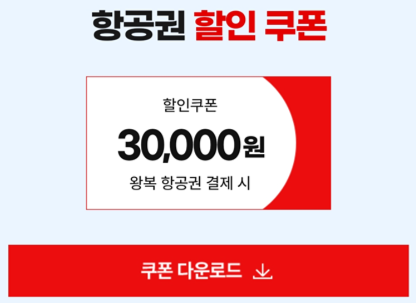 이번 사이판 프모모션과 함께 왕복 항공권 결제 시 3만원 할인쿠폰을 지급하고 있습니다. 최대50% 할인에 추가로 3만원 할인 쿠폰을 다운로드 받으면, 결제 단계에서 쿠폰적용을 하여 3만원 더 저렴하게 최종 결제가 가능합니다.
